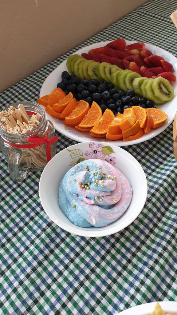Other stuff on food table to confirm with the theme where some mixed rainbow color twisted marshmallows (store brought) and candies but highlight of the table for rainbow dip with fruit platter.